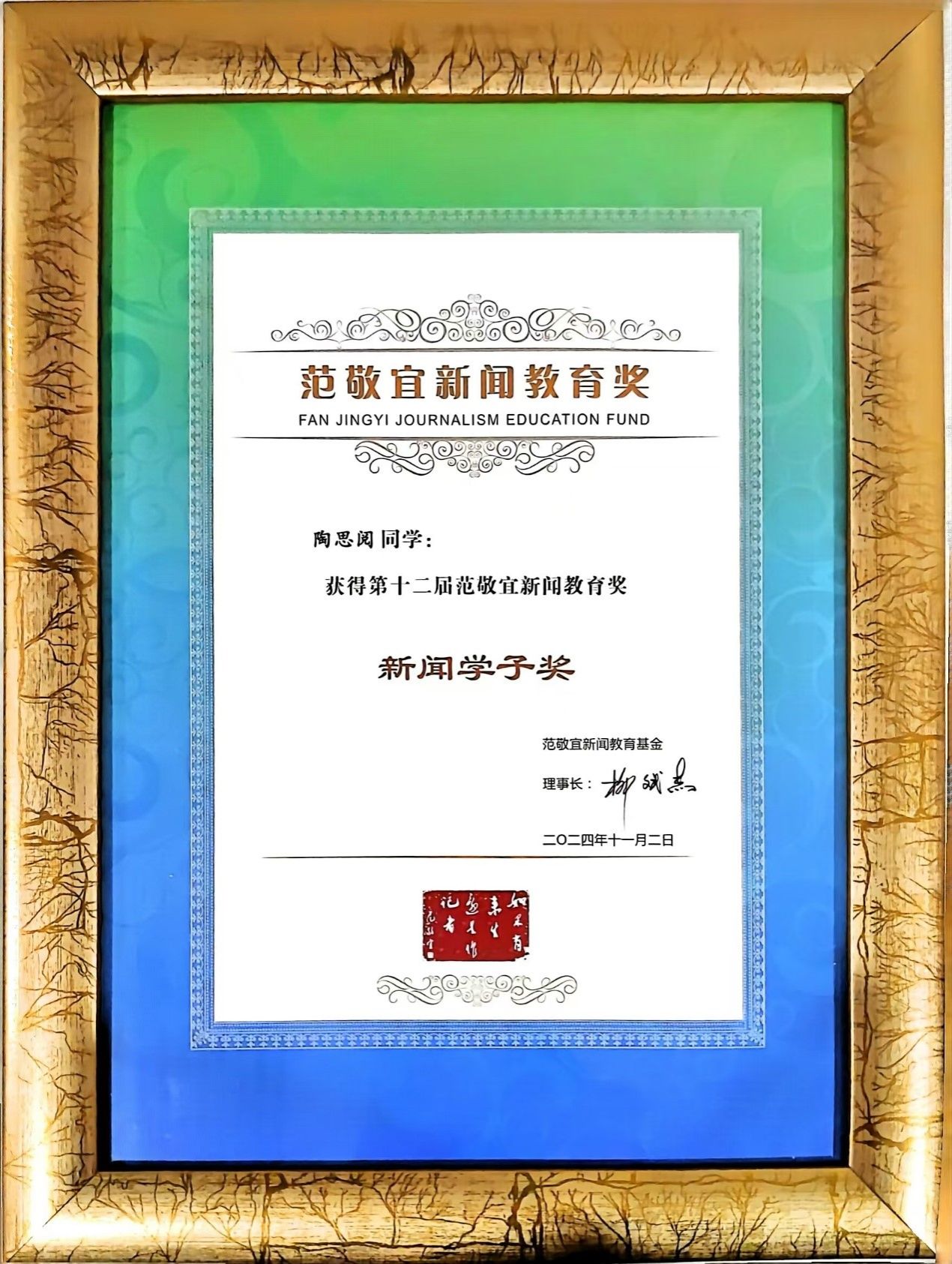 2022级硕士研究生陶思阅获范敬宜新闻教育学子奖。