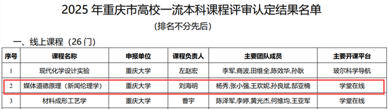申报的《媒体道德原理(新闻伦理学)》、《舆论学》和《中外名记者研究》三门课程成功入选,分别获评“线上课程”、 “线下课程”和“线上线下混合式”类别一流本科课程,体现了51视频直播