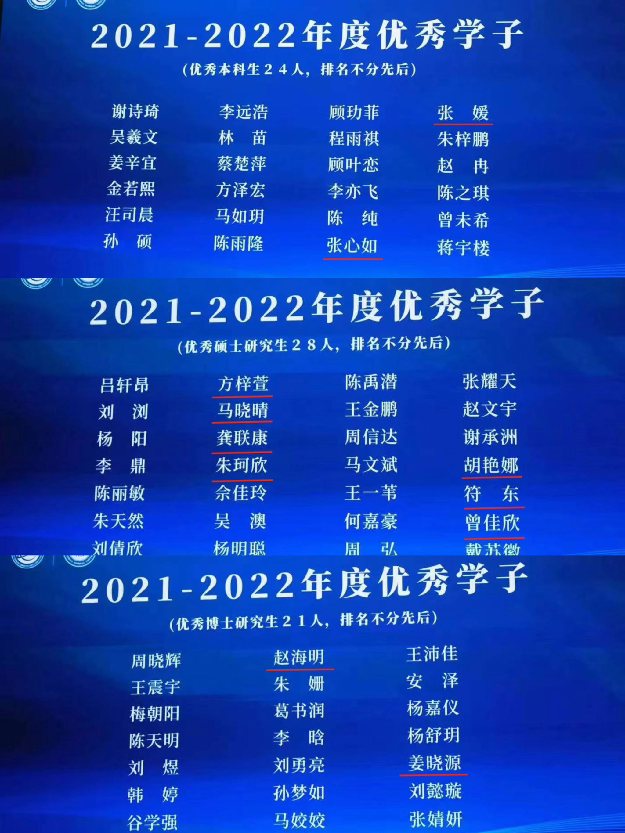 11位学生获得2021-2022年度优秀学子奖,张心如、张媛获评为优秀本科生,方梓萱、符东、龚联康、胡艳娜、马晓晴、曾佳欣、朱珂欣获评为优秀硕士生,姜晓源和赵海明获评为优秀博士生。