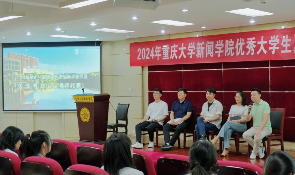夏令营还进行了两场师生互动。在“优秀导师面对面”交流环节,吴明华副教授、郭毅副教授、范虹副教授、黄贺铂副教授、朱宇鹏副教授作为导师代表参加活动。同学们踊跃提问,导师代表积极回应,围绕“虚拟空间叙事与传播”“在重庆应当如何结合城市特色做身体研究”“人工智能对新闻业的影响”等话题进行深入交流,现场氛围轻松活跃。