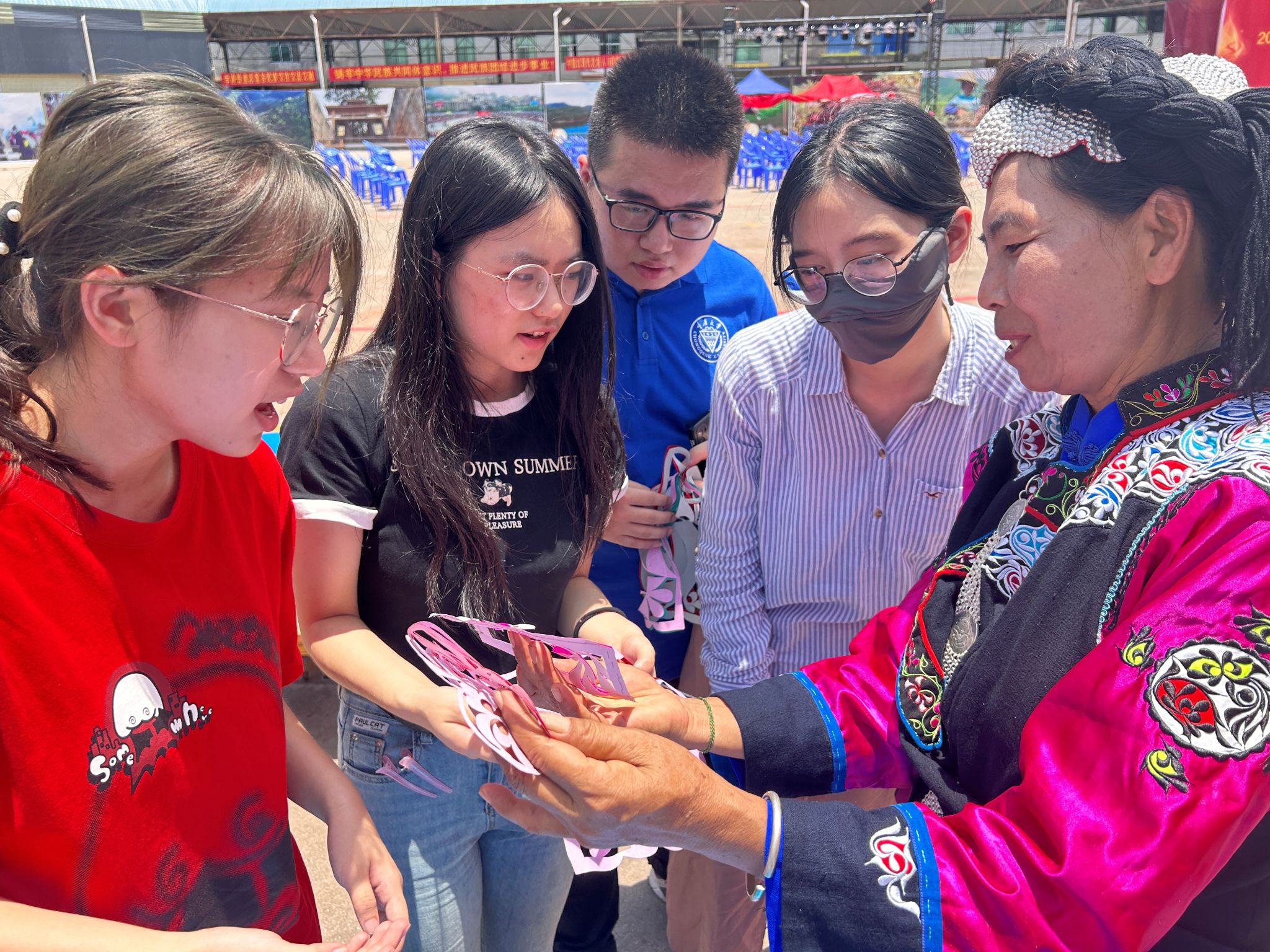(学生采访彝族绣娘,通讯员 许晴 摄)