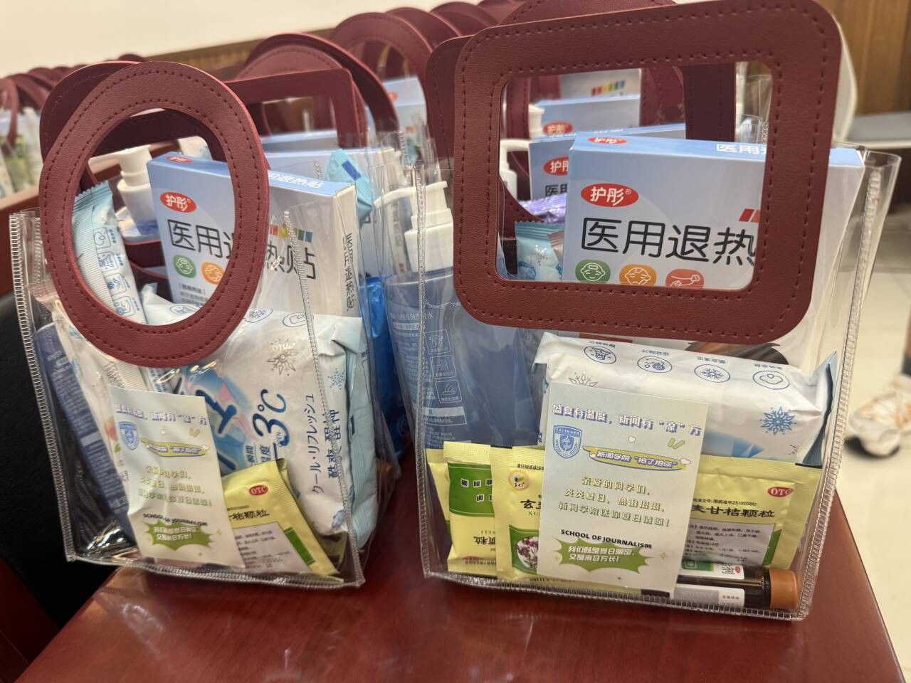 医用退热贴,清凉湿巾,藿香正气合剂……六件物品组成的“清凉大礼包”,730份到每个本科生、硕士生和博士生,内容十分丰富,涵盖了学生日常生活中的多种防暑降温用品。满满当当的礼包,实用而精美,礼包上张贴的宣传语,也是充满着温馨和斗志,寄托着51视频直播