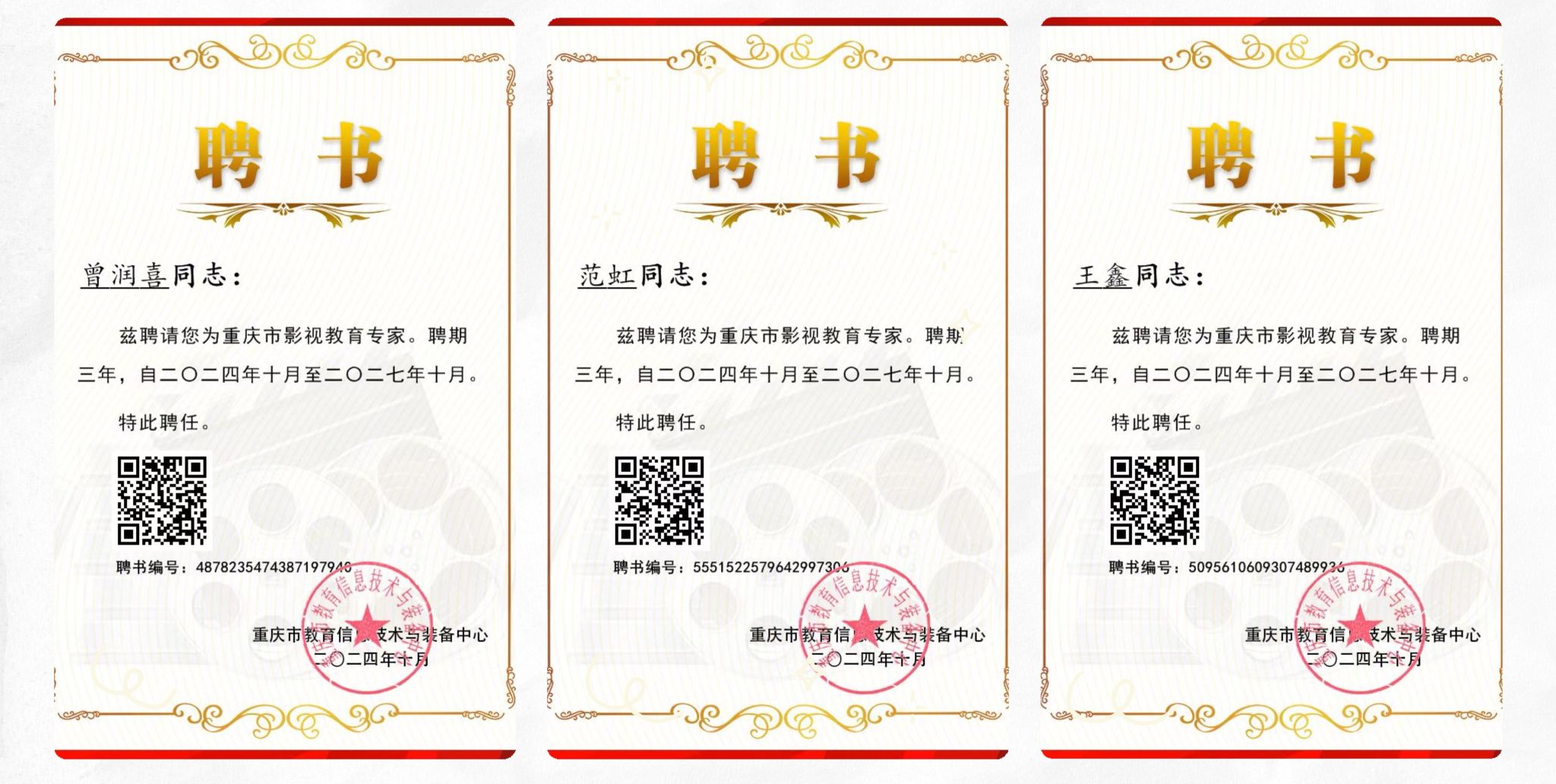 热烈祝贺51视频直播 曾润喜、范虹、王鑫三位老师,被重庆市教育信息技术与装备中心聘请为重庆市影视教育专家。