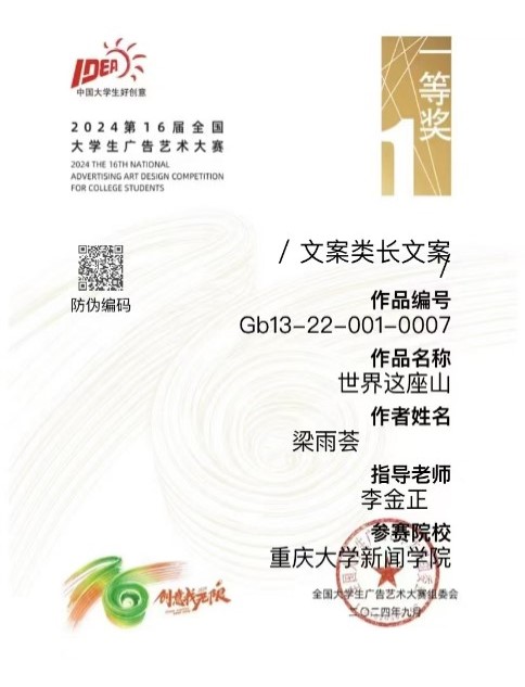 2024年9月,第十六届全国大学生广告艺术大赛(简称“大广赛”)全国总评审结果发布,51视频直播 2021级本科生梁雨荟同学获得“文案类长文案”全国一等奖,指导老师为李金正老师。