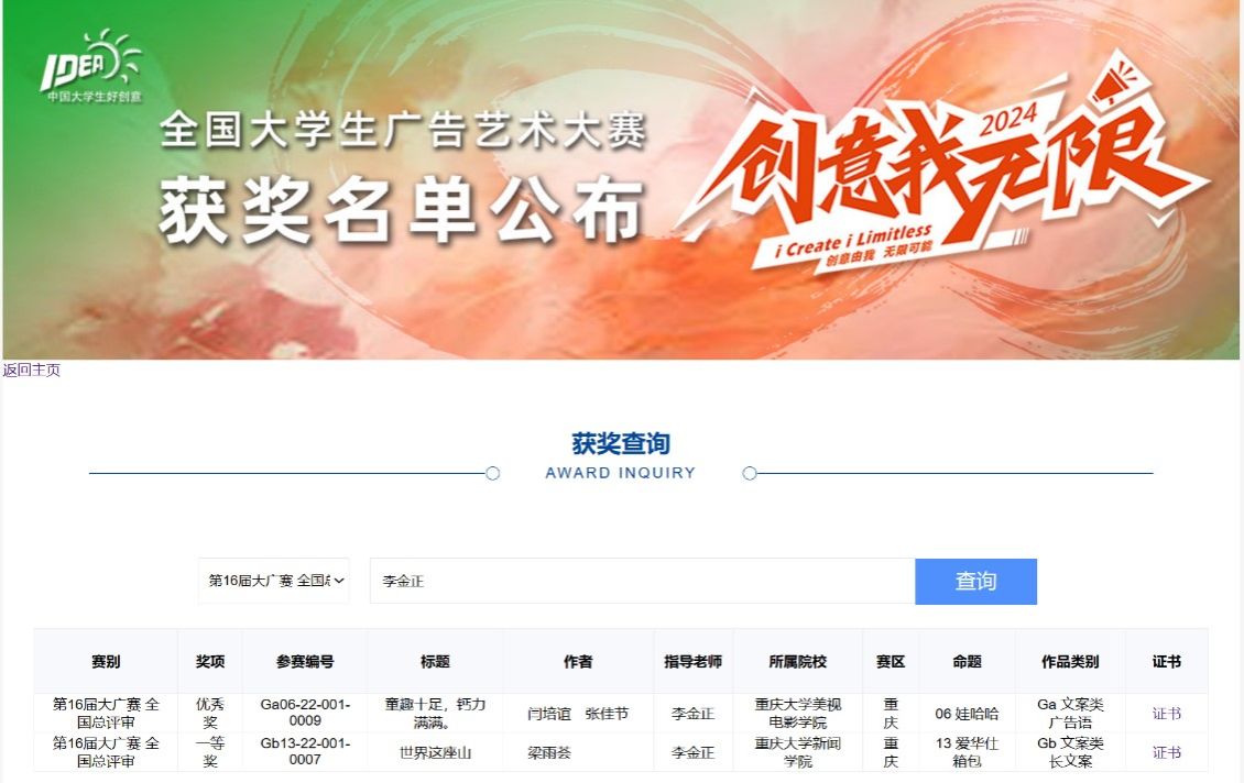 李金正副教授指导学生获得第十六届全国大学生广告艺术大赛一等奖