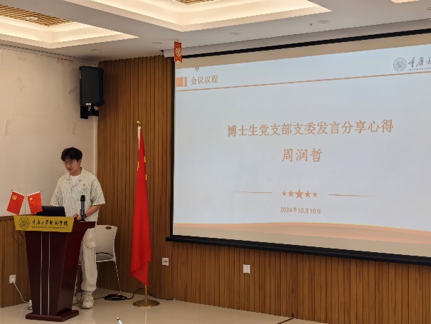 在发言分享环节,博士生党支部支委黎一达和周润哲同志分别进行了心得分享。他们结合个人经历和支部工作实际,畅谈了党支部建设的重要性和个人成长的体会,赢得了与会党员的热烈掌声。
