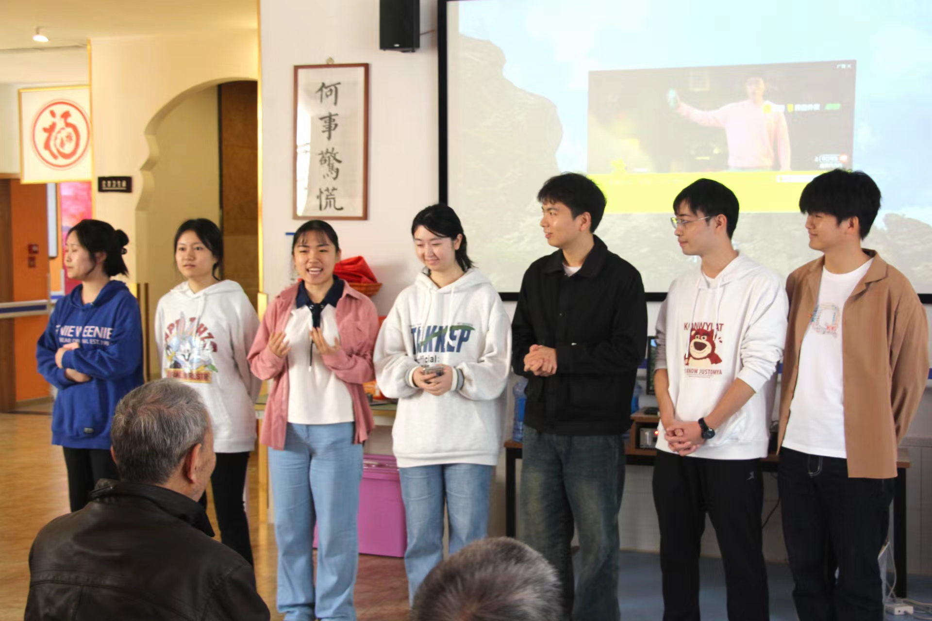 志愿者的到来让福禄寿养老院一下子热闹起来。活动开始前,志愿者们为在场的爷爷奶奶们献唱了三首耳熟能详的歌曲,悠扬的歌声环绕在重庆福禄寿养老院,志愿者们用精彩演唱博得了台下爷爷奶奶们的阵阵掌声。