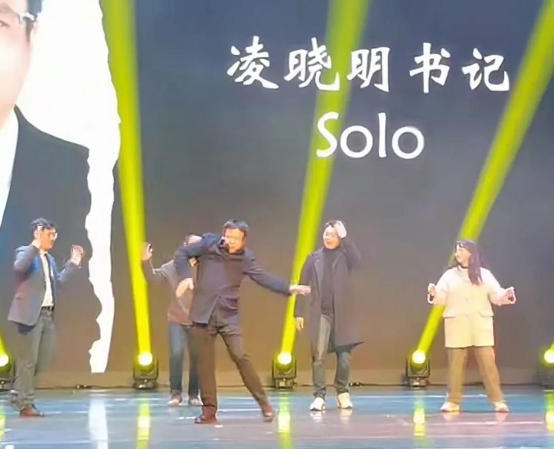 党委书记凌晓明在晚会上大秀霹雳舞,嗨爆全场。据了解,在独舞环节,凌晓明穿着正装,跳着上世纪流行的霹雳舞,在动感的音乐中扭动身体,喜感又魔性,台下的观众们发出阵阵高呼。